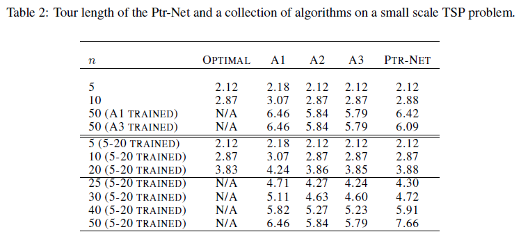 - Pointer Net 모델은 소규모(n ≤ 50) TSP 근사 해법을 학습함. 결과를 보면 기존의 알고리즘보다 계산 시간 측면에서 이점이 있음을 파악 가능